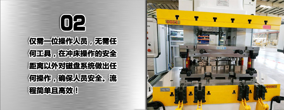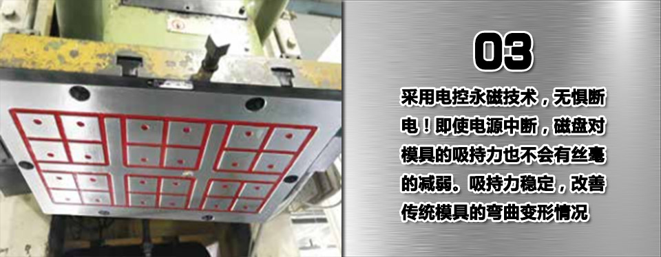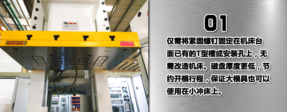 沖床在更換模具時(shí), 常耗費(fèi)大量的人力及時(shí)間,造成企業(yè)生產(chǎn)成本提高,也降低生產(chǎn)制造的效率,直接影響到整體企業(yè)產(chǎn)能。希望您采用魯磁科技電永磁快速換模系統(tǒng)后,實(shí)現(xiàn)沖床快速更換模具,降低換模時(shí)間,提升良品率,并且大大的促進(jìn)產(chǎn)量提升,增強(qiáng)企業(yè)競(jìng)爭(zhēng)力。HQMC沖床用電永磁快速換模系統(tǒng)適合任何形狀和尺寸的模具,已有的模具無(wú)需修改就可以用在配備有HQMC系統(tǒng)的沖床上,不需要制定特殊的模具標(biāo)準(zhǔn),節(jié)省設(shè)計(jì)和制作時(shí)間,降低成本,同時(shí)可以在磁盤(pán)上增加各種您所需要的設(shè)備:定位裝置、沉孔、下模延伸板等都可以定制添加。對(duì)于裝備有長(zhǎng)條形模架的模具,HQMC磁盤(pán)上的磁極可設(shè)計(jì)為相應(yīng)的長(zhǎng)條形,從而提供最佳的效果。下??稍黾覶型槽,適用于絕大多數(shù)的模具升降滑軌。電永磁快速換模系統(tǒng)采用磁路技術(shù)和脈沖放電技術(shù),用電控來(lái)改變永磁體的磁路分布,靠永磁體吸附模具,夾緊與放松過(guò)程只需幾秒鐘,工作過(guò)程中不需電能維持,完全避免了傳統(tǒng)換模方式的諸多缺陷。所有的注塑機(jī)、合模機(jī)、壓模機(jī)都是電永磁快速換模系統(tǒng)的配套對(duì)象。