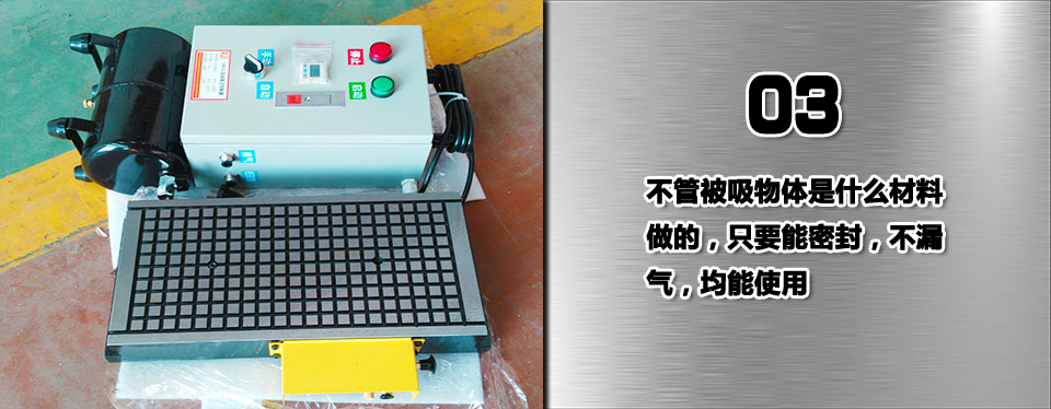 1.本產(chǎn)品無需配備真空泵,只需連接常規(guī)空壓機,便可快速強力吸附任何材質(zhì)的版料(如:鋁板銅板,不銹鋼板,橡膠板,玻璃板,紙板等絕緣板),鐵板,鋼板也可達到很好的吸附效果。